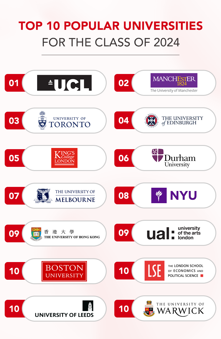 在我校学生所就读的顶尖高校中,76.9%位于英国,其中90%属于罗素集团。此外,加利福尼亚大学作为一个综合性大学系统,也是备受欢迎的选择,28名毕业生选择入读。