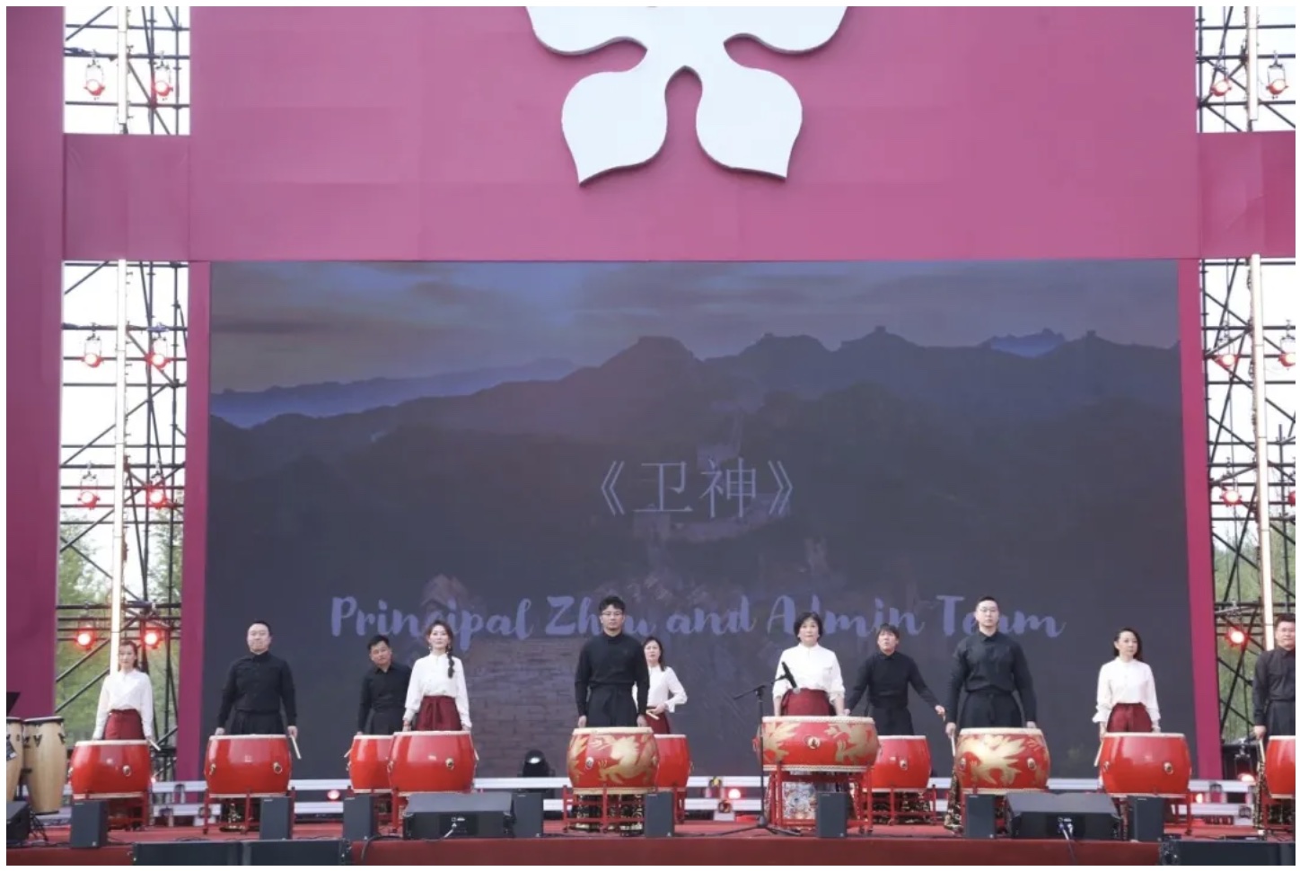 而如果用一个词来概括这台校庆演出,那便是“传承”。北京德闳创校校长周心欢女士领衔老师们带来的中国鼓表演《卫神》。每一次敲击,都仿佛在诉说着中华文明的故事,每一声回响,都彰显着国潮的澎湃力量。