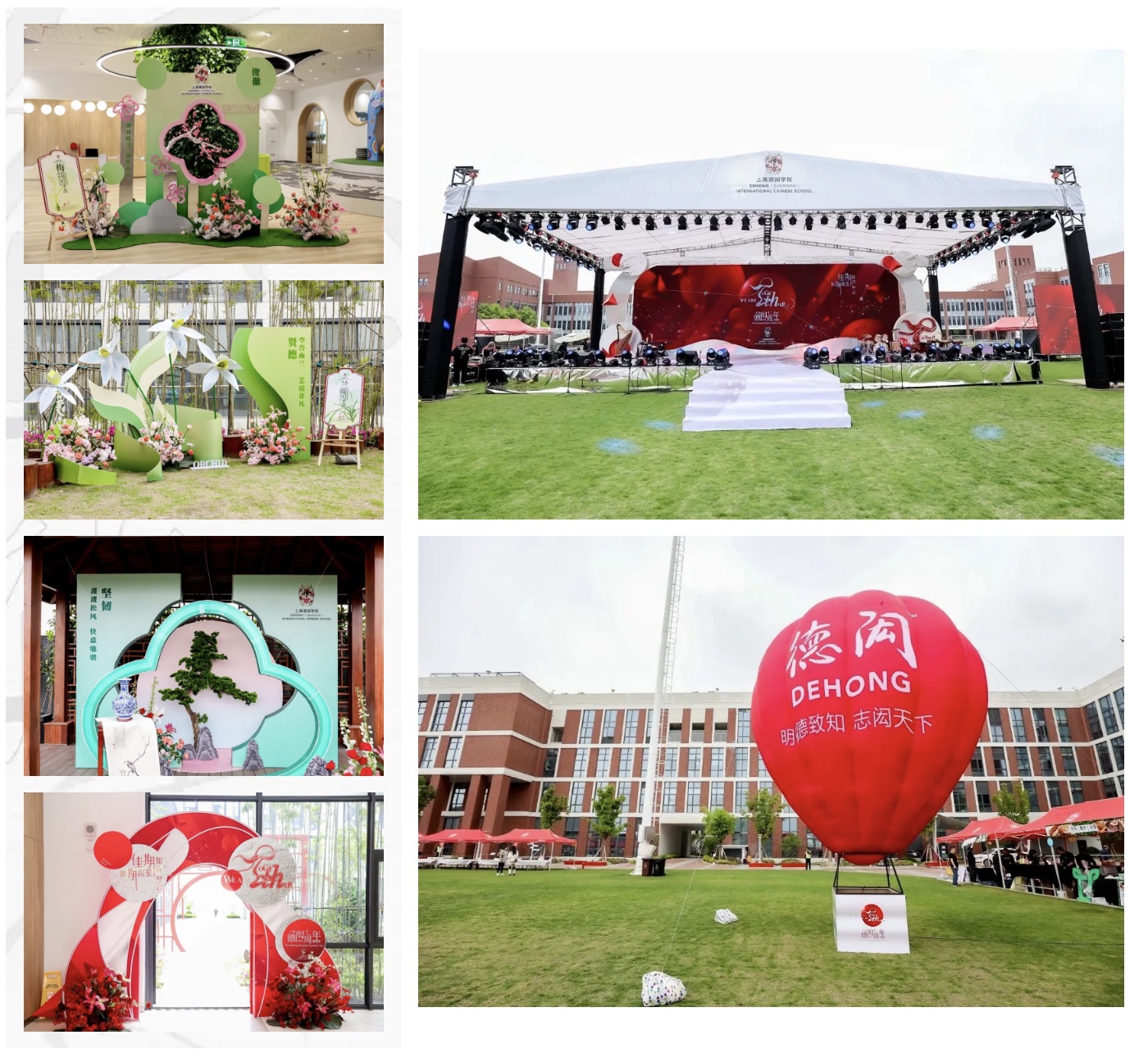 校庆日当天的校园布置可谓别处心裁,看点颇多。在特别设置的“梅兰竹菊松”二期建筑设计理念打卡点中,大家回顾了学校发展的里程碑,通过建筑中融入的传统文化中象征“君子品格”的植物元素,更是体味到了德闳的理念和对每个学子的期待。而操场上巨大的红色热气球更是成为全场瞩目的焦点,让大家感受到德闳助力学子点燃青春梦想,放飞凌云之志的愿景。