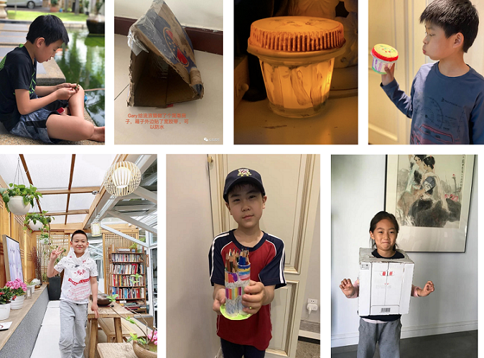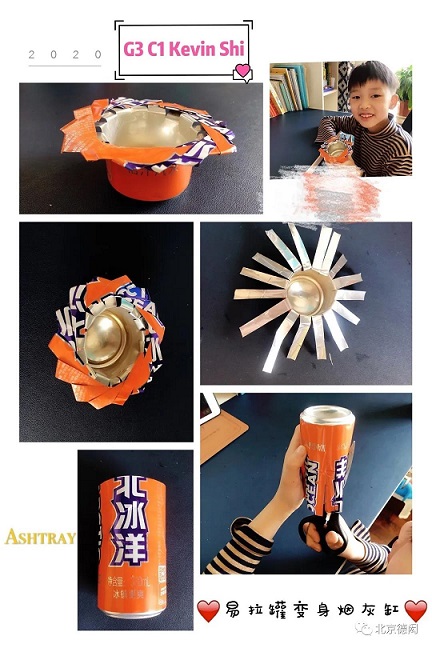 三年级的孩子利用废品再创造——塑料T恤、吸管拖鞋、易拉罐烟灰缸、环保夜灯、流浪动物避难所、天然蘸水毛笔......