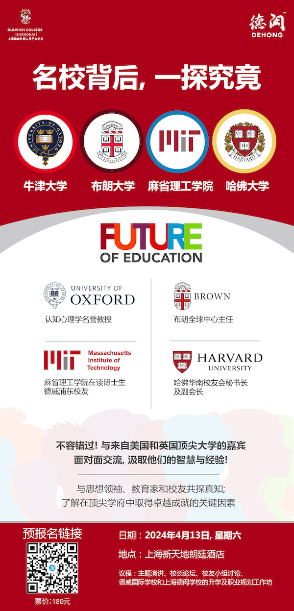 不仅如此,我们还荣幸地邀请了哈佛校友Jason Shi,目前他在哈佛大学华南校友会担任秘书长及副会长一职;以及德威浦东2020届校友Frederick,目前他正在麻省理工学院攻读博士学位,他们的成功故事将激励与会者,分享高等学府过去与现在的日常生活与变化,展现教育的变革力量。